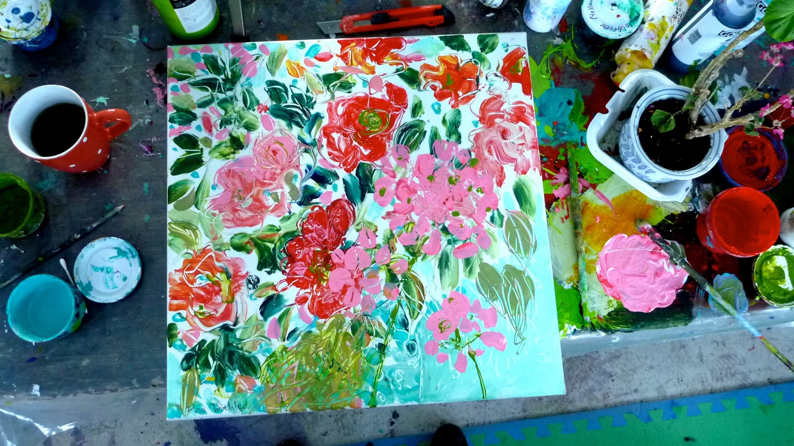You can see in this photograph that the Amaryllis is still showing through the green. That transparency is because of the gel medium that I added to the colors.